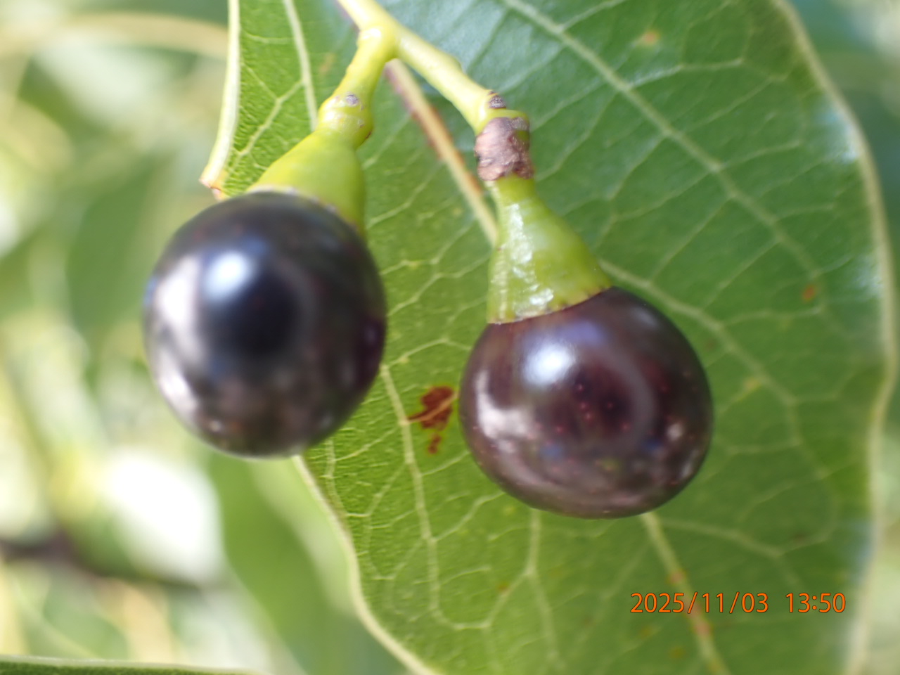 果実も緑色の時は樟脳臭が強いが、黒紫色に熟すと消える。鳥に散布してもらうため。