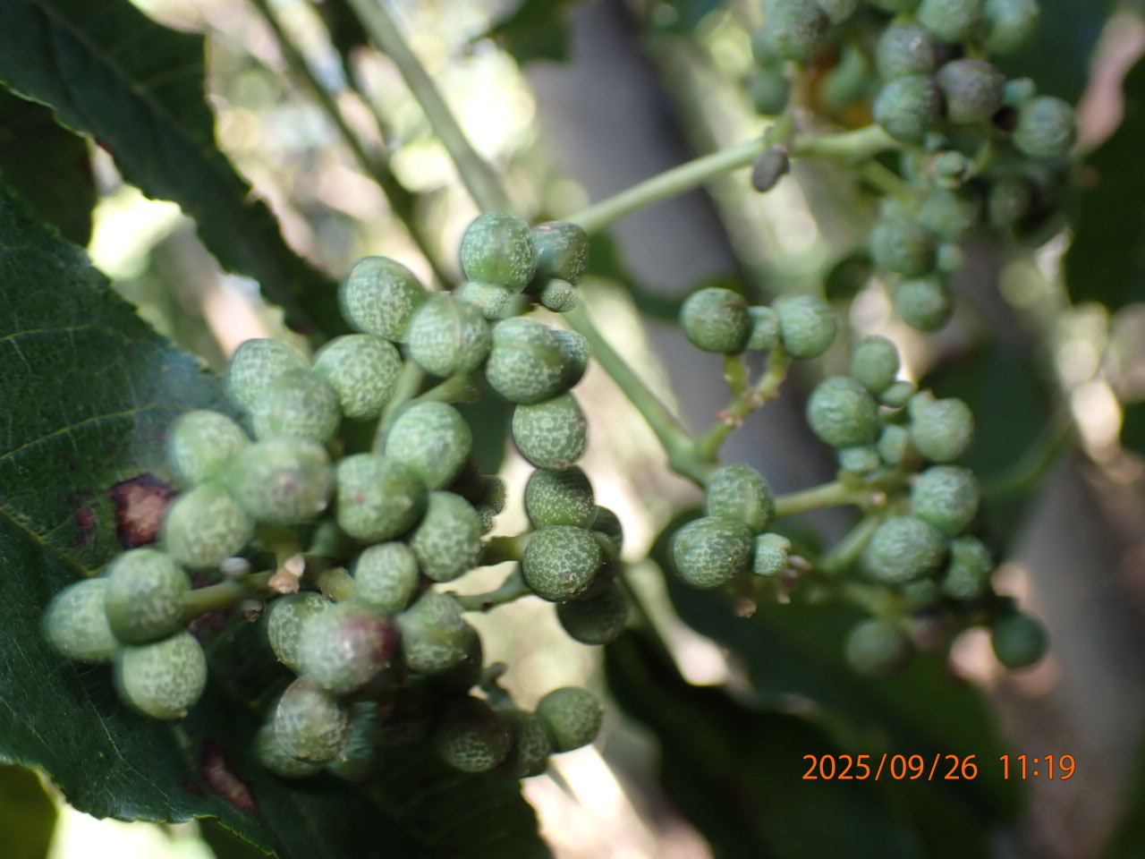 一部の果序は12月下旬から自然脱落し始め、落下した果序の果肉は閉じたままで、乾燥すると果肉が割れて黒い種子が出てくる。