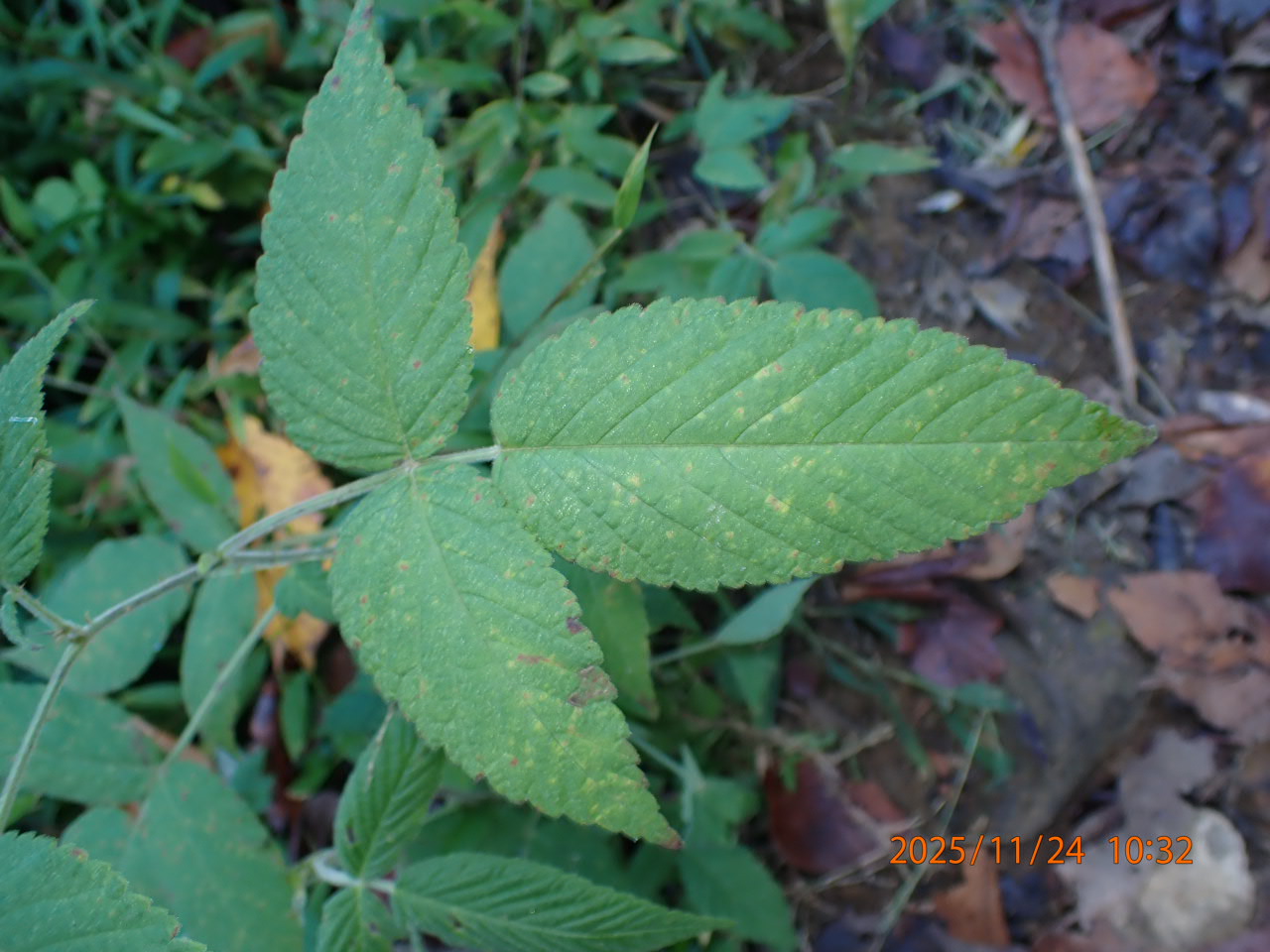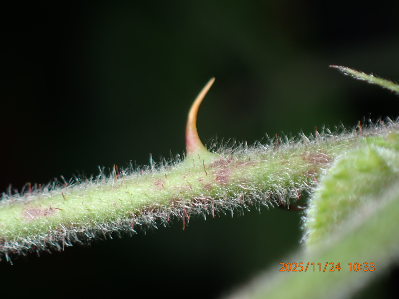枝、葉柄、葉表に軟毛と腺毛が多い。枝に疎らにとげあり。