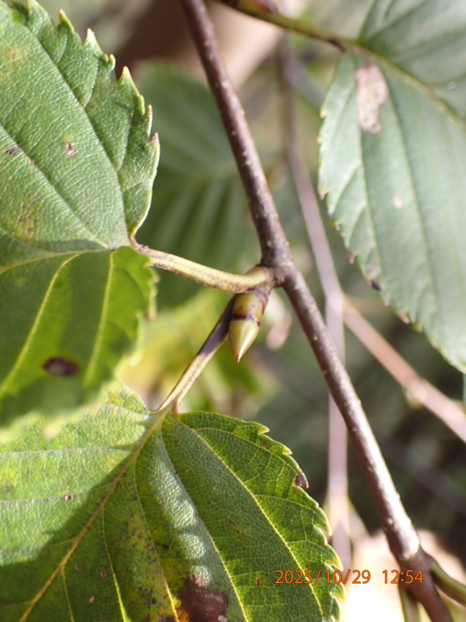 葉はミズキよりやや大きく細長い同じ長さ 6月頃黄白色の花が咲く 2枚の芽鱗に包まれ尖っており黒褐色 -