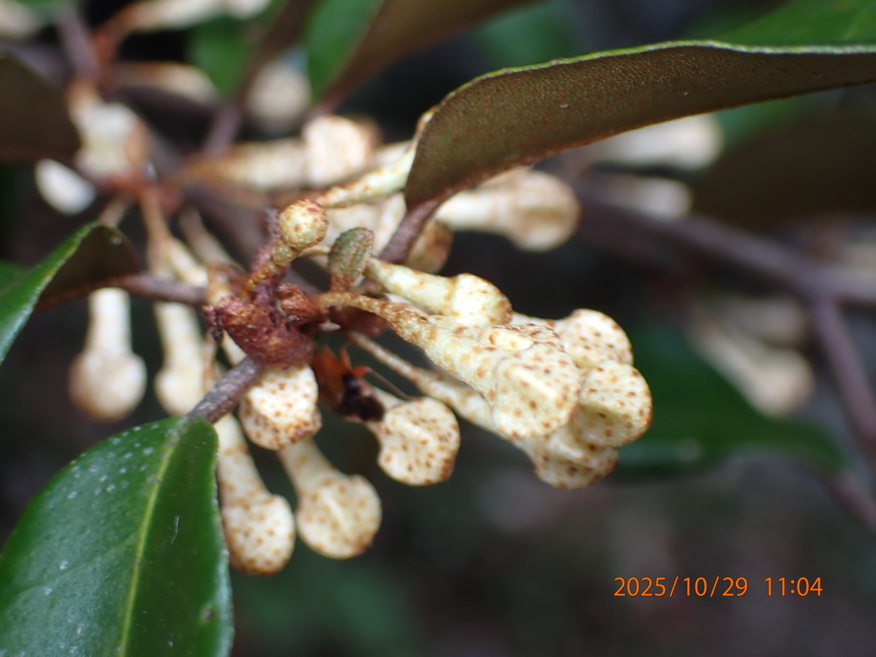 花:両性花、単花被花(花冠なし萼のみ)、淡褐色、虫媒花