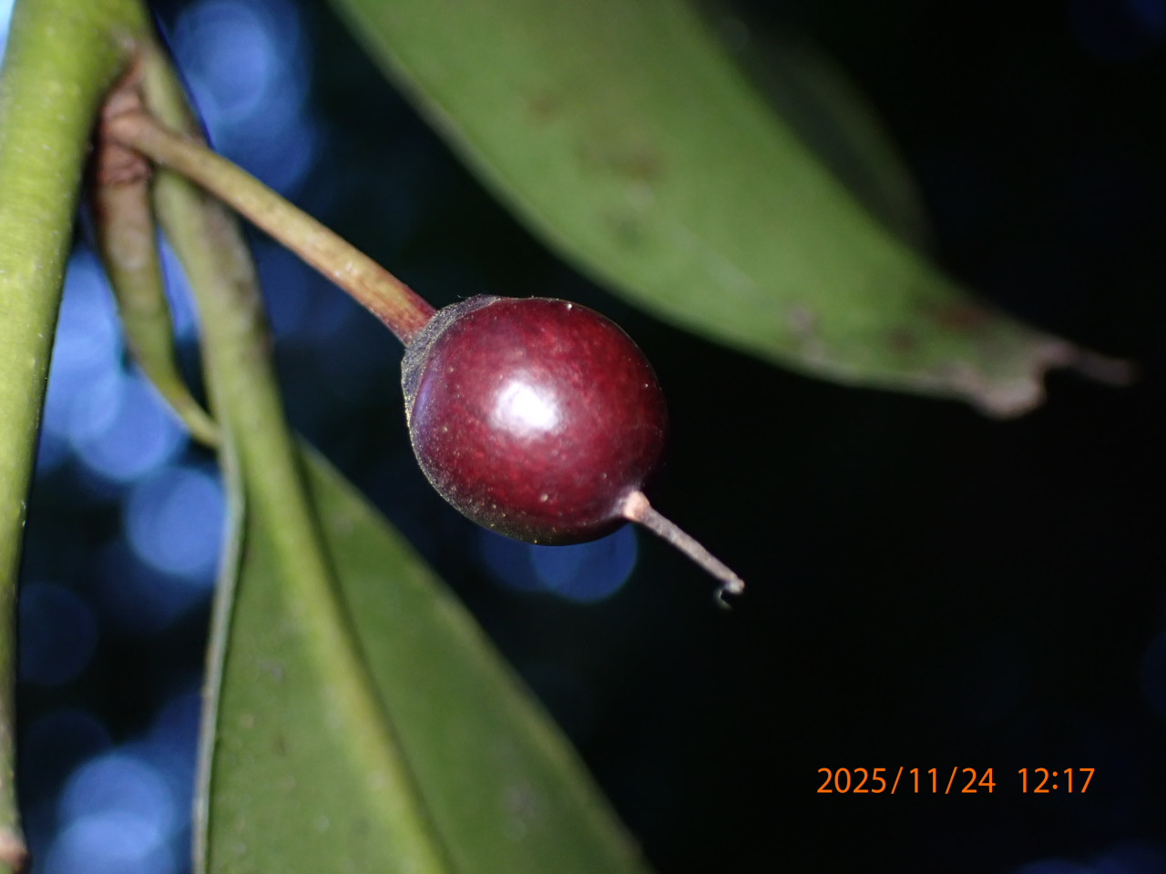 果実:液果、黒紫色、先端に長い柱頭が残る、動物(主に鳥)散布