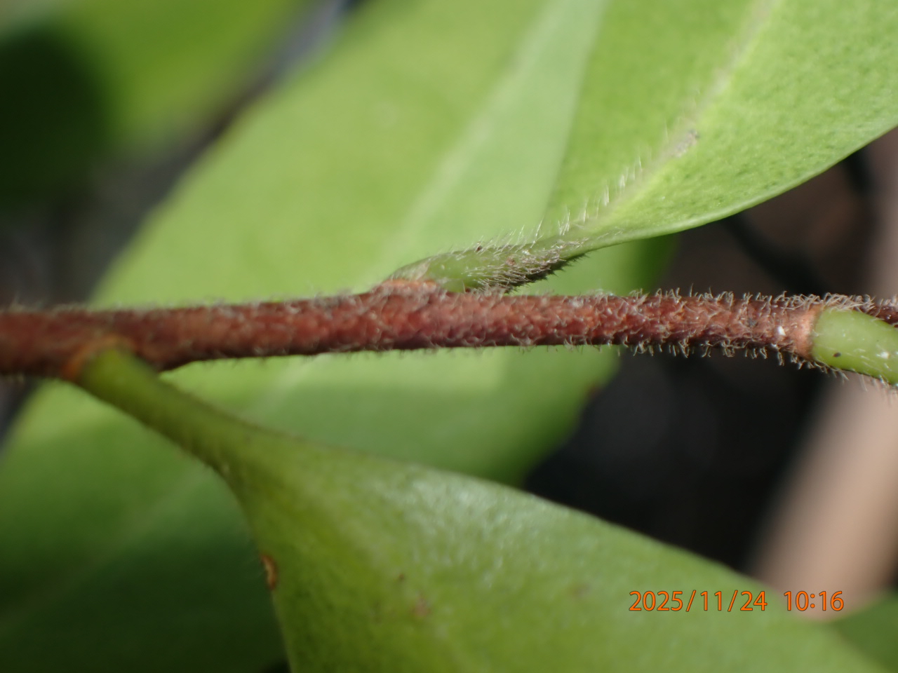 葉:互生、全縁、先が突き出て鈍く尖る、裏の側脈はほとんど見えない