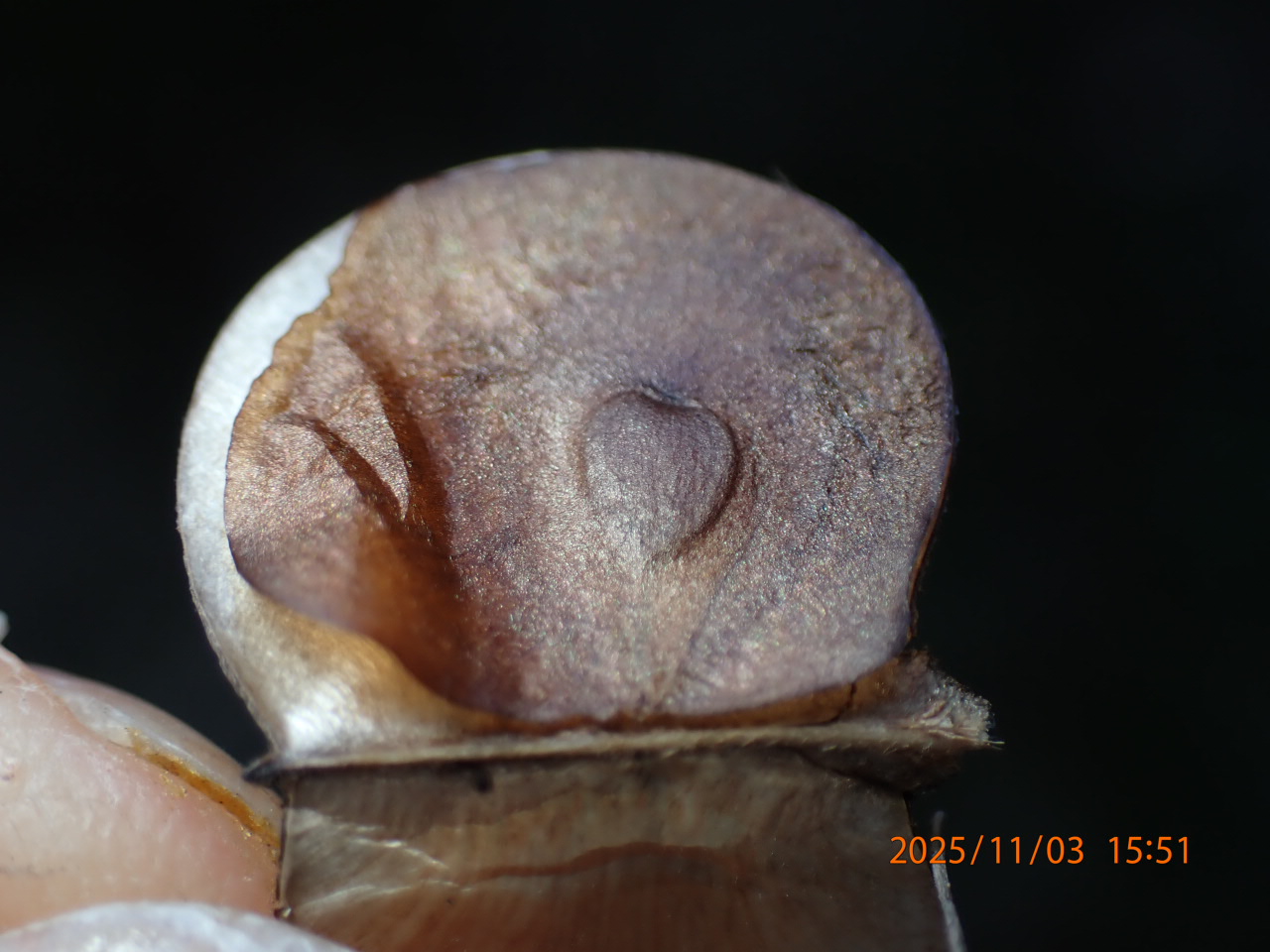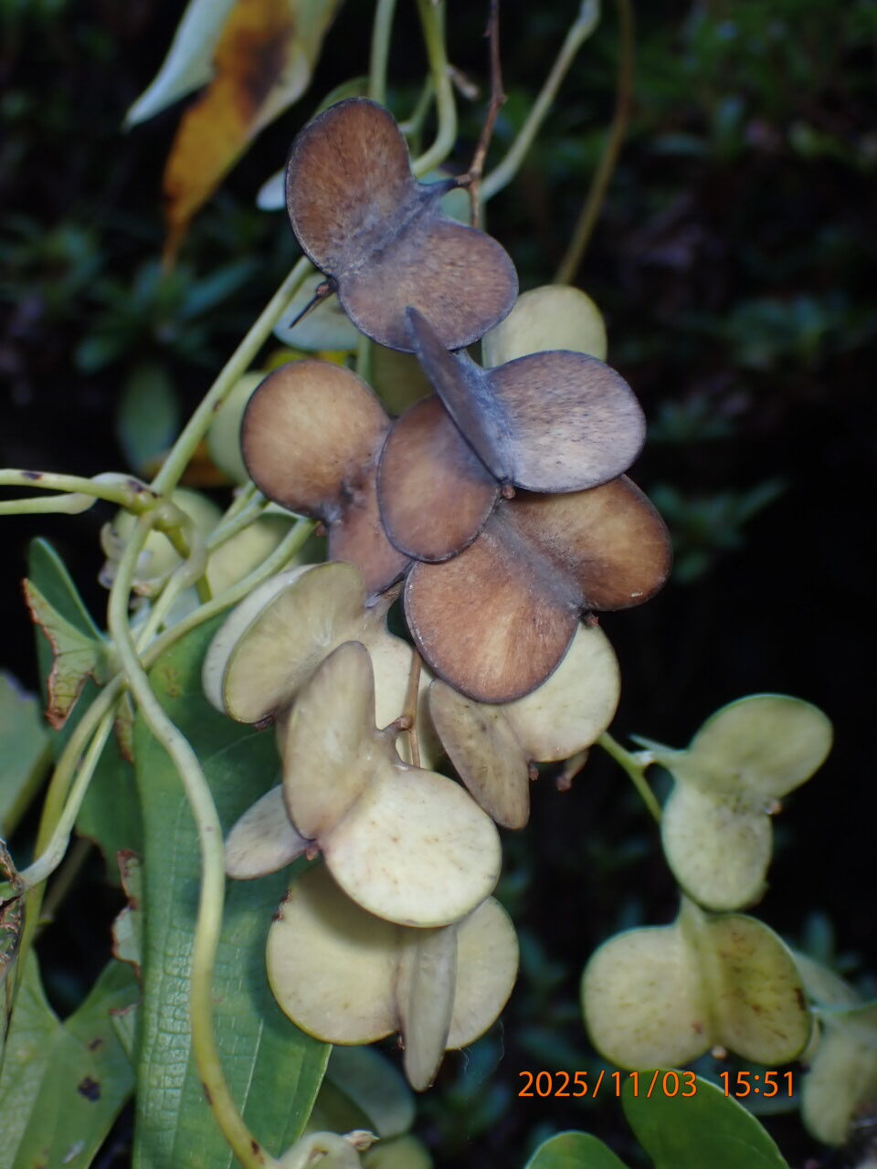 果実:蒴果、平たく円形の翼が3個あり、裂けると偏平で円形の翼をもつ種子が飛び散る