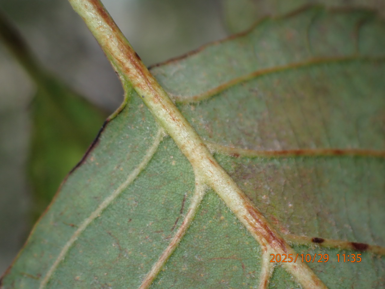 葉は、五角形で長さ、幅とも10~30cmと大きく、基部は深く切れ込み、裏側は赤褐色のフェルトのような毛で覆われている。