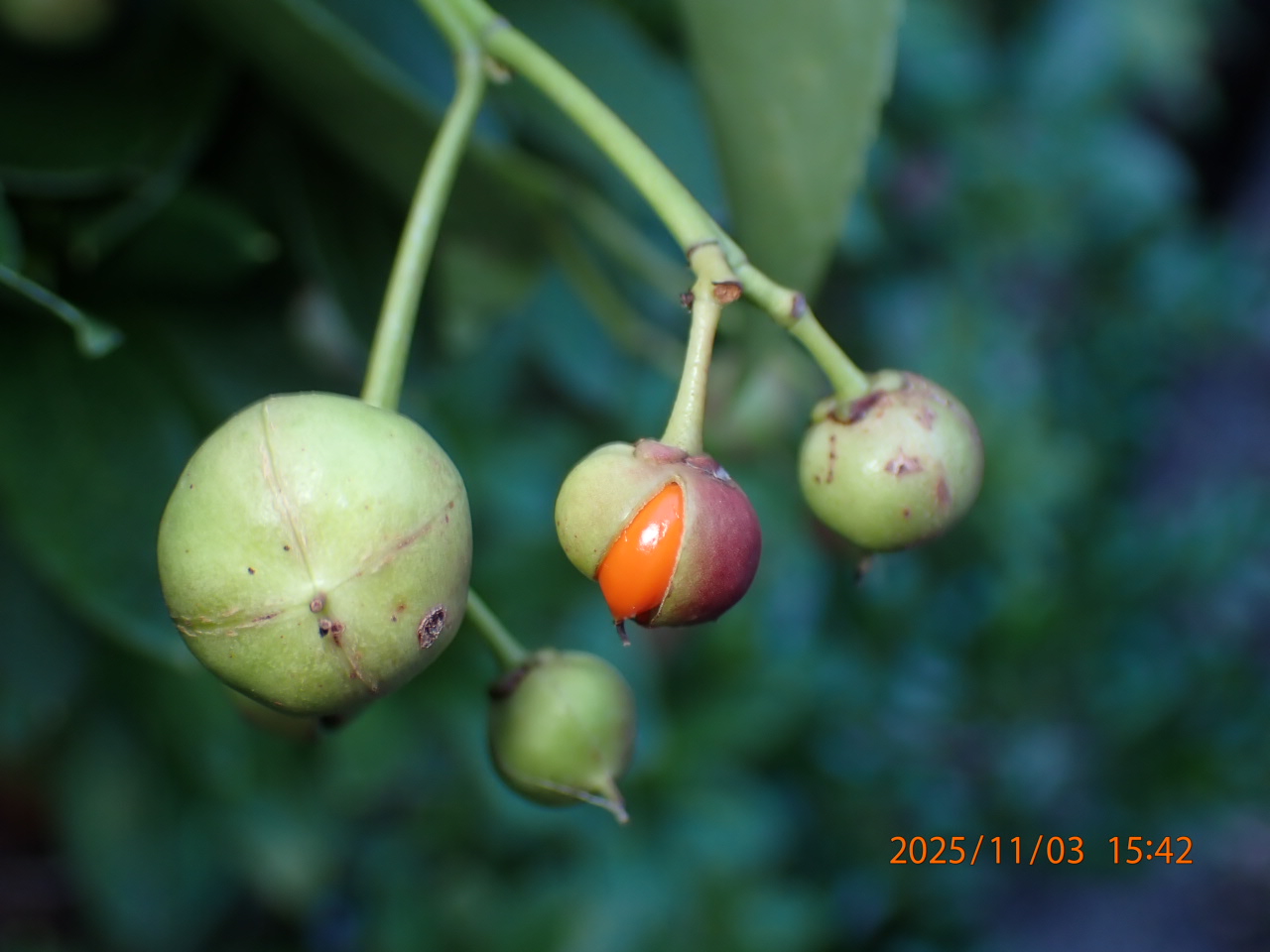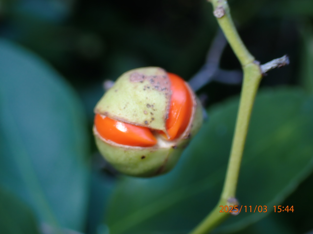 果実:蒴果、黄色に熟すと4裂し橙赤色の仮種皮に包まれた種子を出す