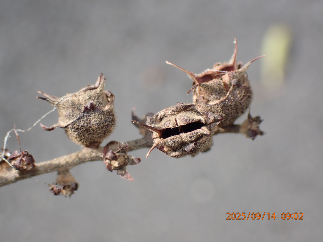果実:蒴果、腎臓形、暗褐色、種子は黒色、熟すと2裂して種子を弾き飛ばす