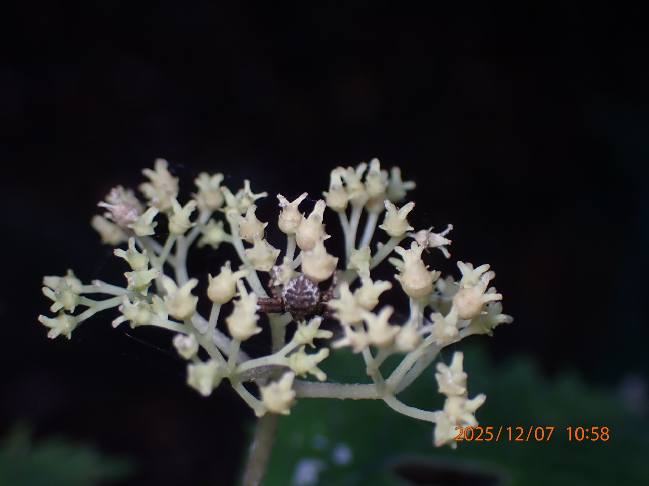 花:両性花、散房状の集散花序、白色