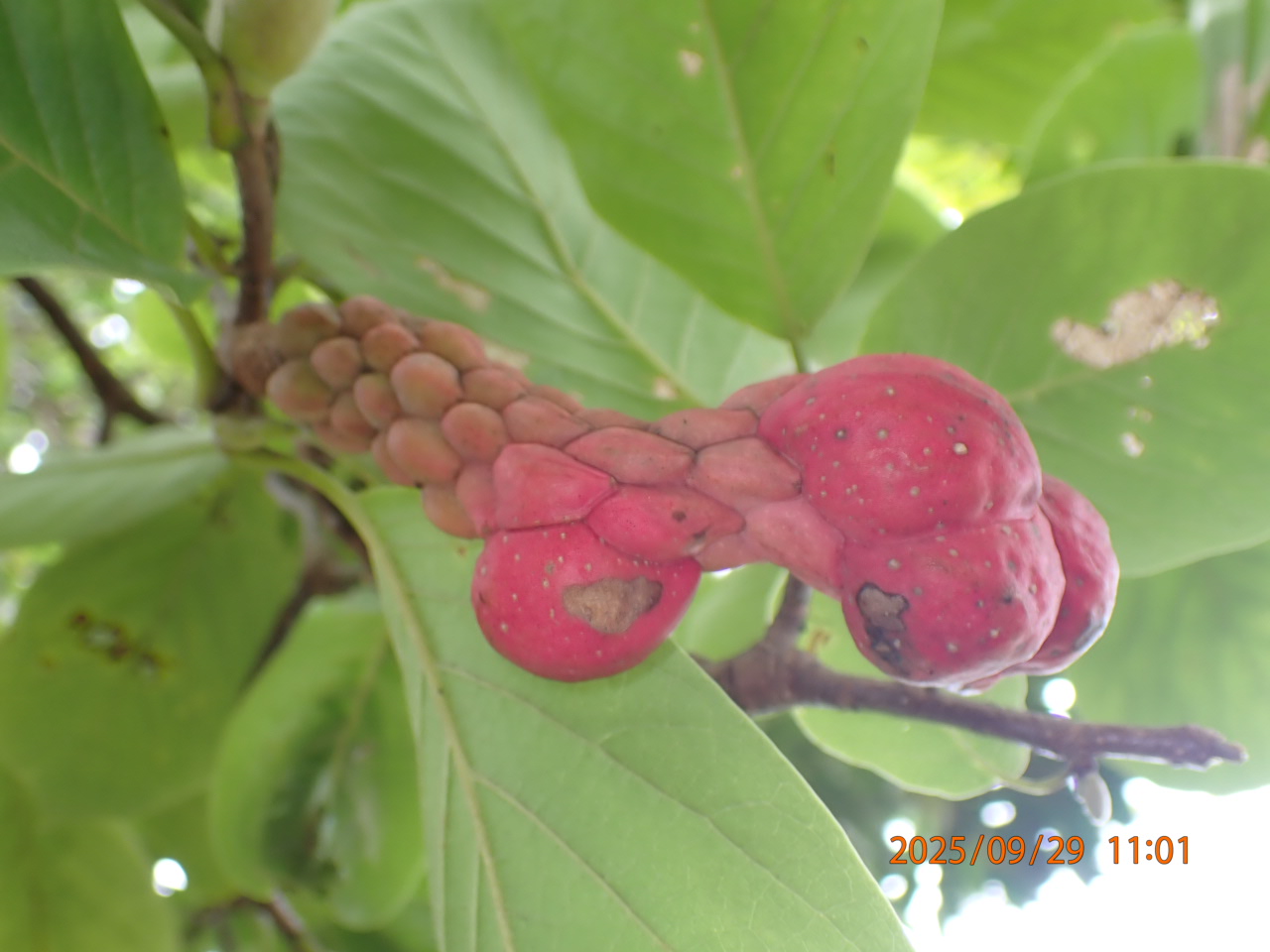 果実:袋果が集まった集合果、赤褐色、種子は赤色